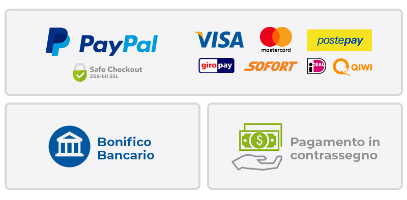 Accettiamo carte di credito, PayPal, Pagamento alla consegna. 1). CARTA DI CREDITO. inclusi Visa, MasterCard, JCB, Discover e Diners, American Express 2). PAYPAL. Il metodo di pagamento più conveniente e sicuro al mondo. 3). PAGAMENTO ALLA CONSEGNA, potrai pagare direttamente al corriere al momento della consegna, costo del servizio €5,00